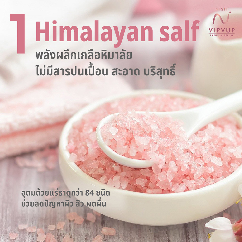 เกลือหิมาลัยนับเป็นเกลือธรรมชาติที่จุดได้ว่ามีคุณภาพดีที่สุด ผลึกเกลือหิมาลายันไม่มีสารพิษปนเปื้อน เป็นเกลือที่สะอาด และบริสุทธิ์ อุดมไปด้วยแร่ธาติที่ครบครัน มากกว่า 84 ชนิด มีคุณสมบัติช่วยให้กล้ามเนื้อผ่อนคล้ายการไหลเวียนของโลหิตดีขึ้น ลดการก่อตัวของแบคทีเรีย ช่วยให้ผิวหนังชุ่มชื่น นุ่มนวล ผุดผ่องดูมีออร่าลดปัญหาผิวหนังต่างๆ เช่น ผิวผื่น