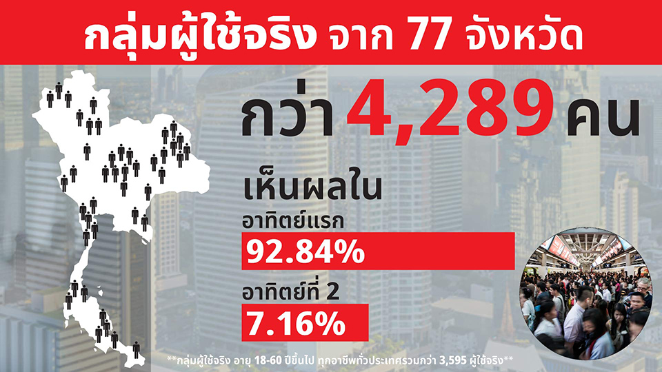 จากตัวอย่างผลลัพท์ของกลุ่มผู้ใช้จริงกว่า 4,289 คน จาก 77 จังหวัด ส่วนใหญ่นั้นได้รับผลลัพท์เป็นที่น่าพึงพอใจเป็นอย่างมาก ส่วนใหญ่พบว่าปัญหาผิวส่วนใหญ่แล้วจะเป็นเรื่อง ลดสิว ฝ้า กระ และจุดด่างดำ
